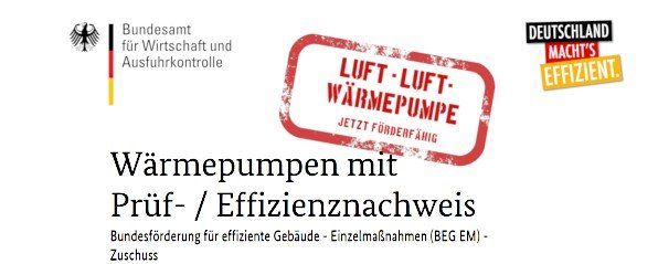 Im Zuge der neuen Förderrichtlinie BEG EM werden ab sofort auch Luft/Luft - Wärmepumpen, als Einzelmaßnahme (EM) im Rahmen der Förderung erneuerbarer Energien für Heizungen, mit bis zu 25 Prozent bezuschusst. Die Zuschüsse nach der BEG EM können seit dem 02.01.2021 beim Bundesamt für Wirtschaft und Ausfuhrkontrolle (BAFA) online beantragt werden.